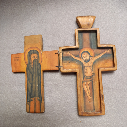 Fijn uitgesneden Koptisch handkruis met daarin een 2 geschilderde religieuze voorstellingen