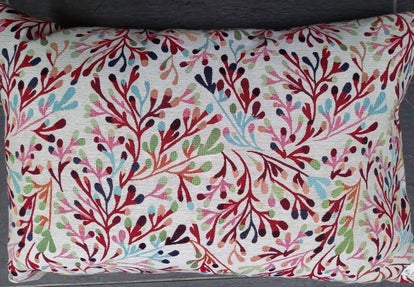 Dit kussen heeft koraal als ingeweven grond motief.