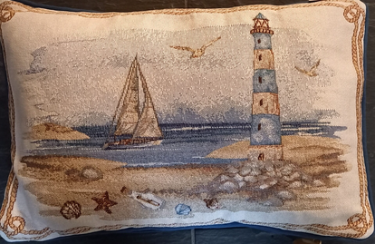 Dit leuke kussen toont een vuurtoren, een zeilboot