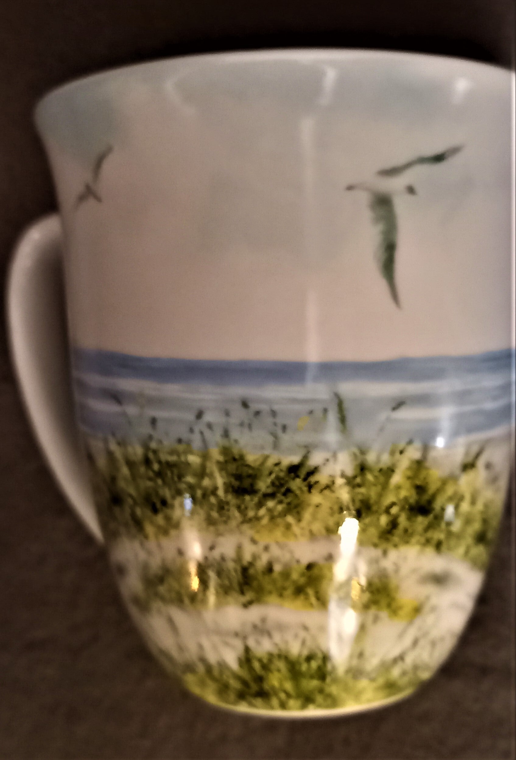 Deze beker is gemaakt van porselein en heeft een strandafgang met geparkeerde fiets als voorstelling.