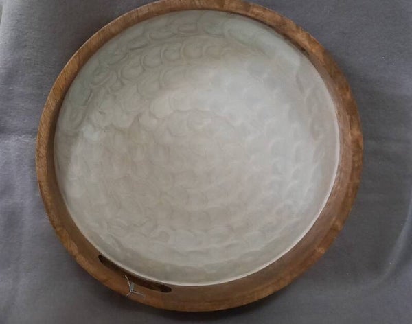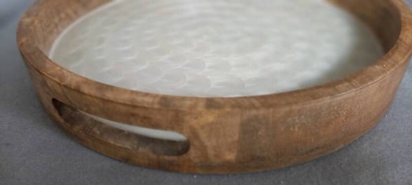Het ronde dienblad is gemaakt van acacia hout en heeft een gewolkte parelmoer binnenzijde op basis van cadiz schelpen.