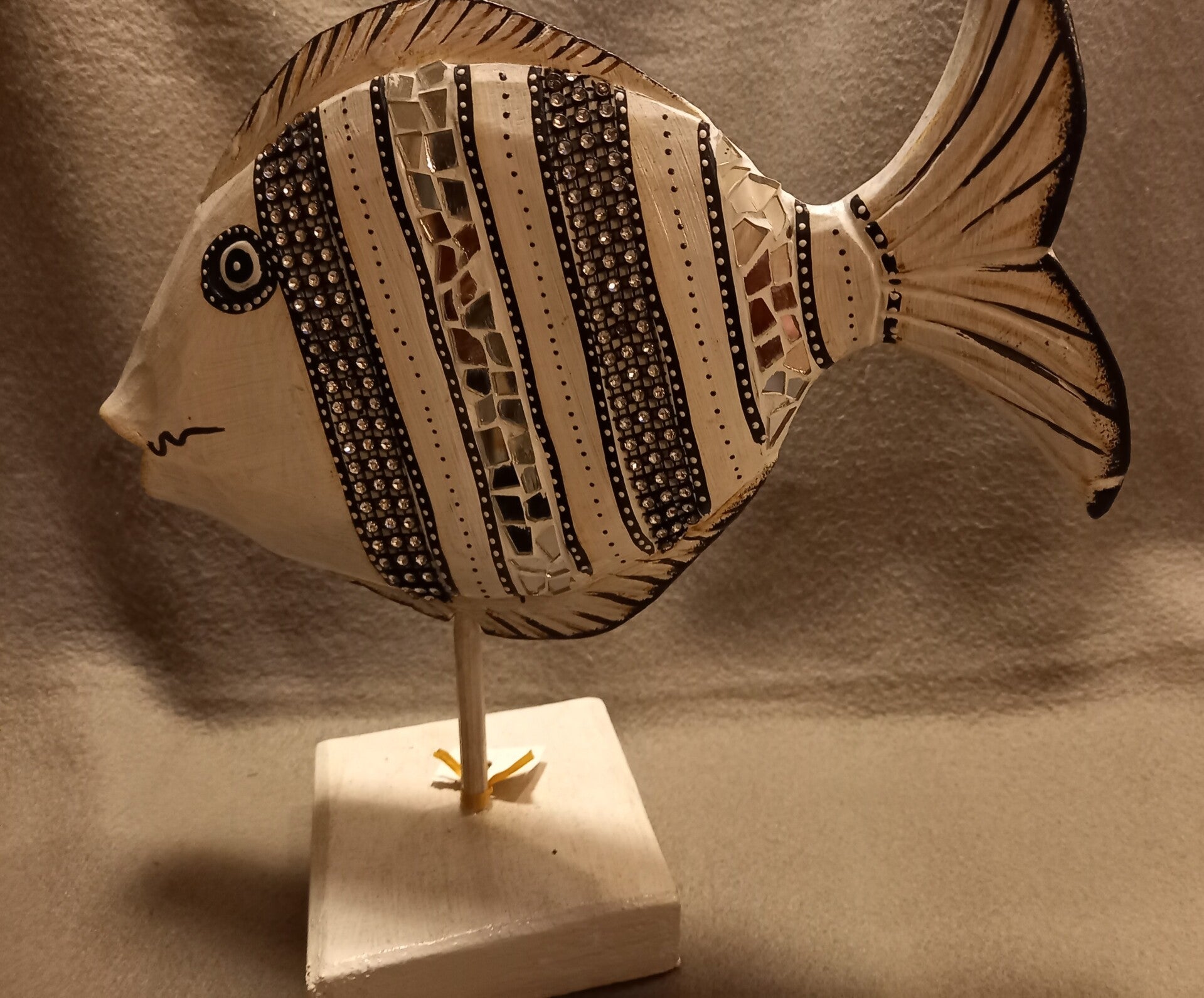 Deze houten vis heeft een vrolijke uitstraling. Hij is