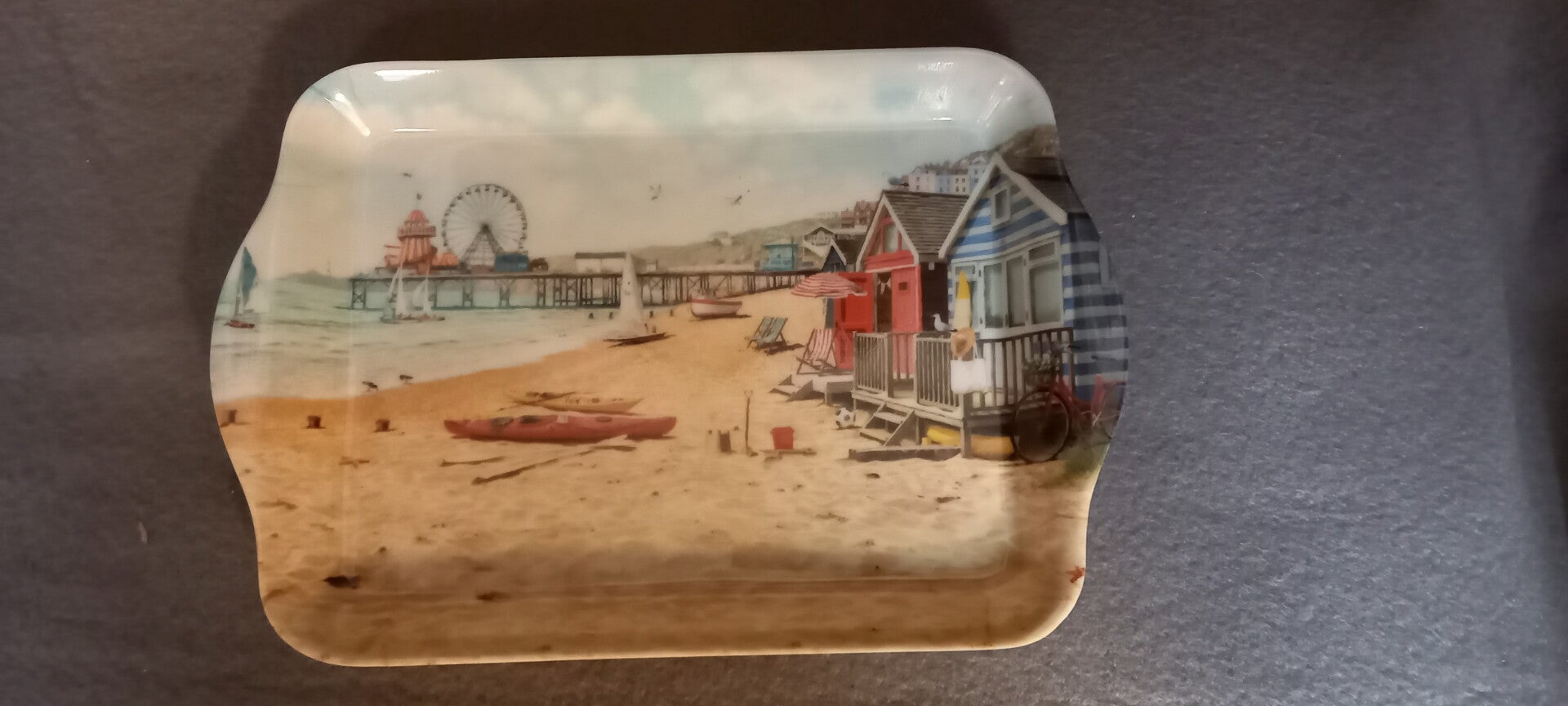 Dit kleine dienblaadje toont een strand met huisjes,