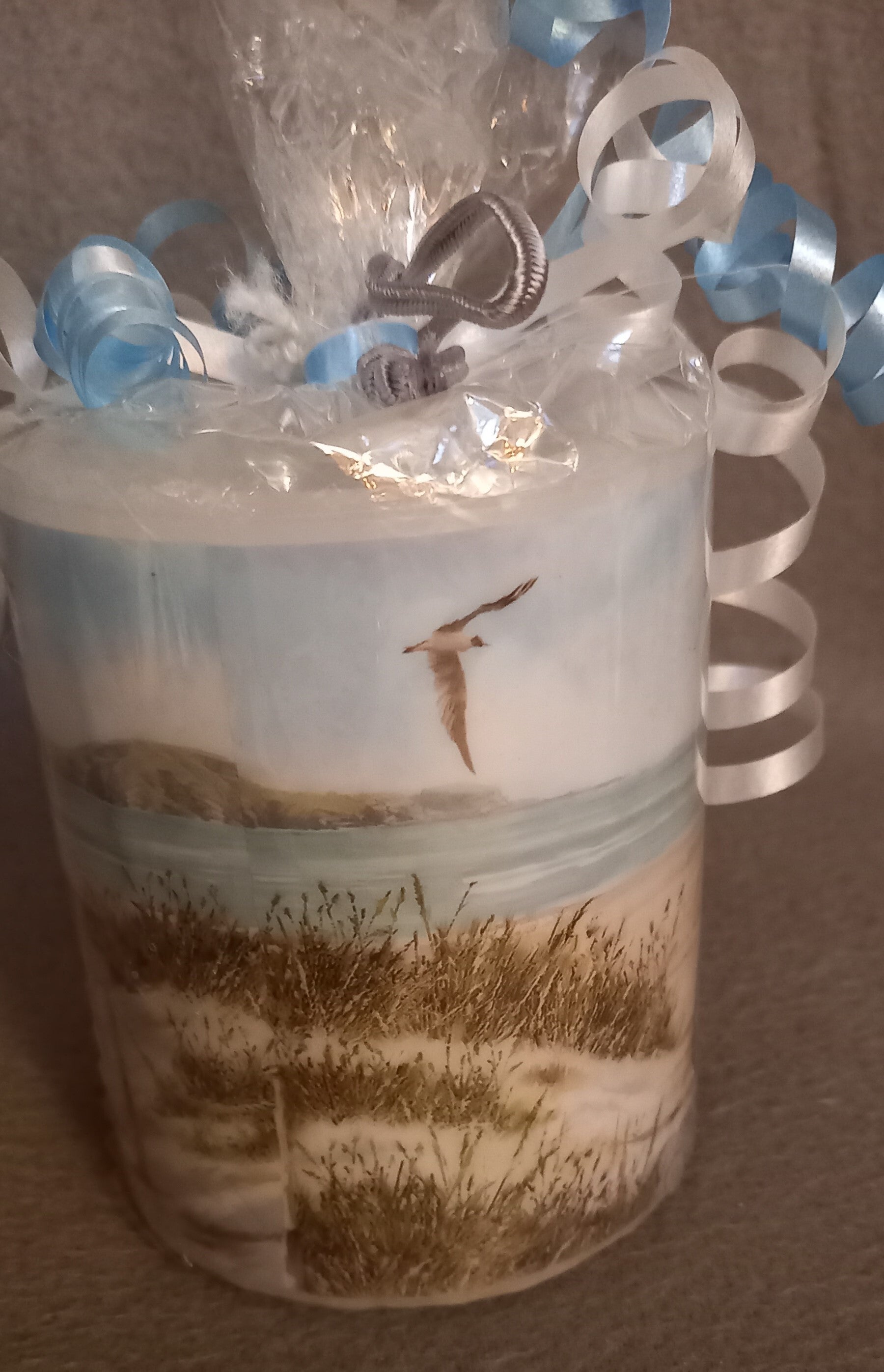 Deze kaars heeft een typisch Hollandse strandafgang met geparkeerde fiets als thema. De kaars heeft een brandduur