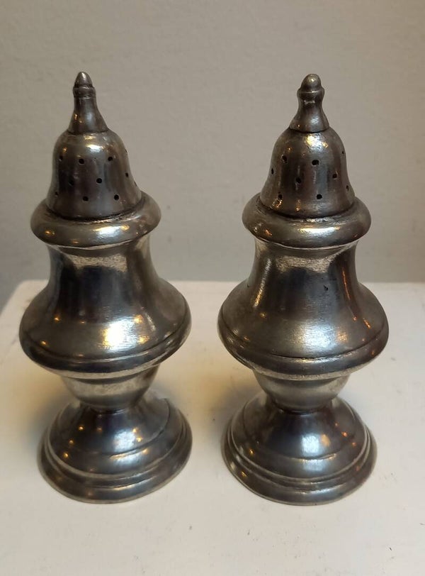 Dit sierlijke peper en zoutstel is helemaal van tin gemaakt.