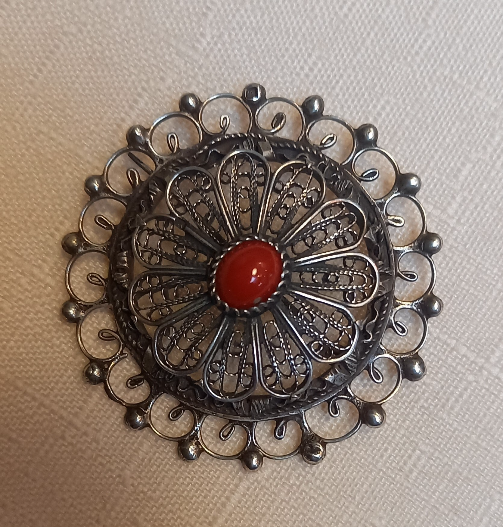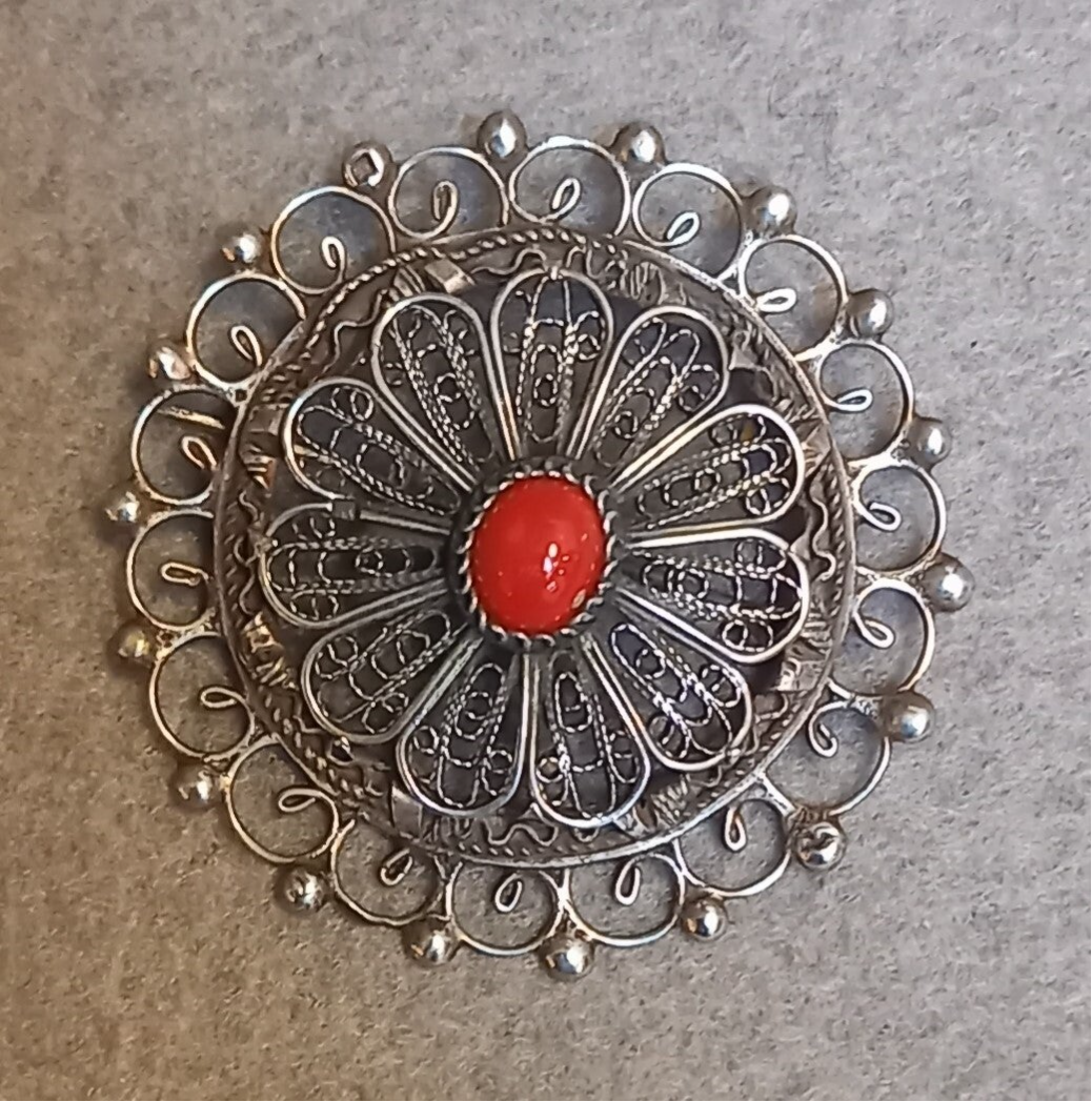 een ronde bloedkoraal. De broche is oud en