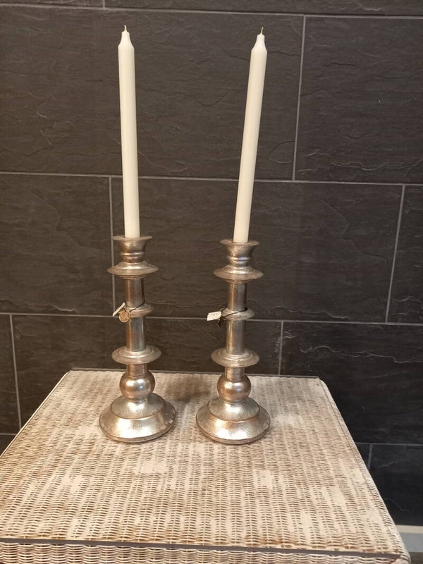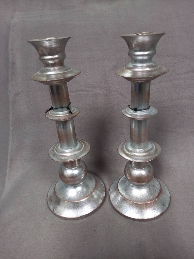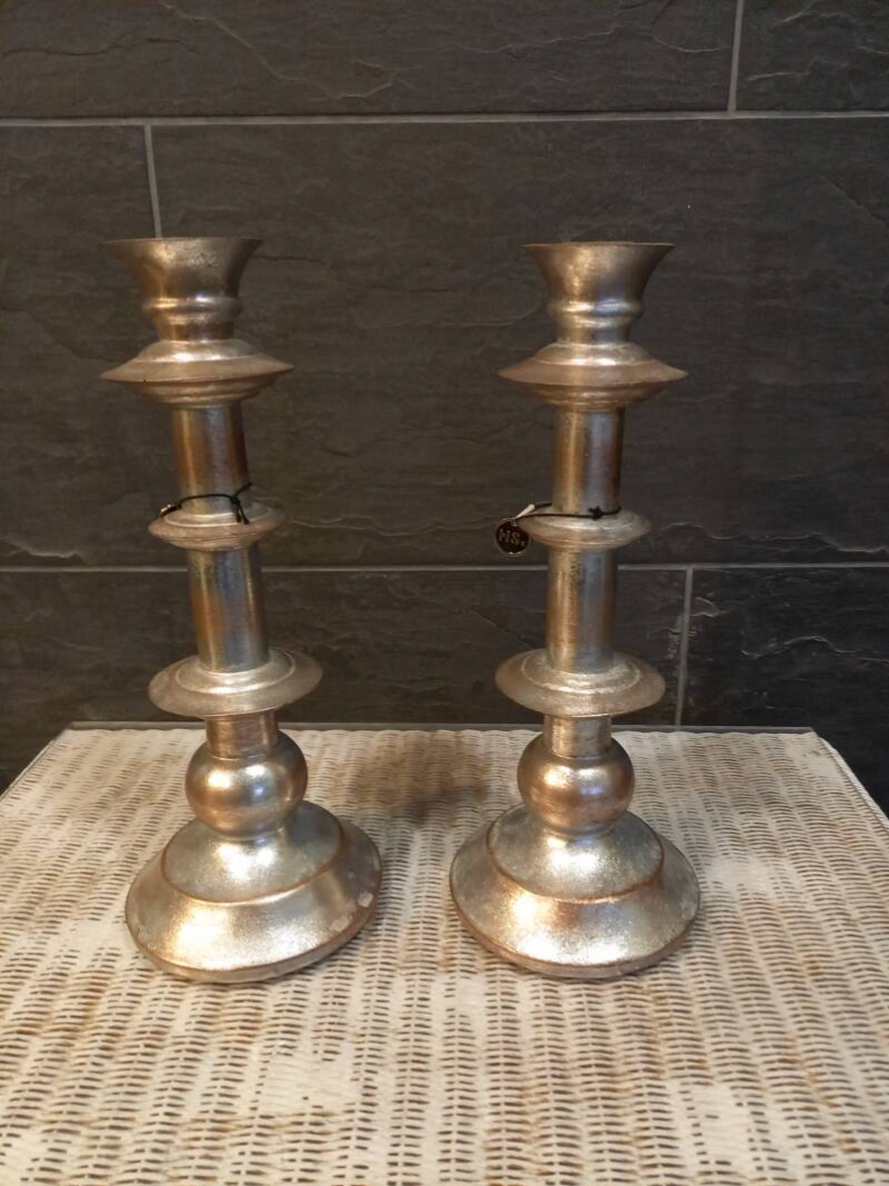 Deze kandelaars zijn glanzend en zilverkleurig.