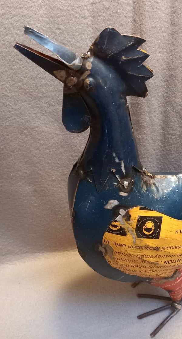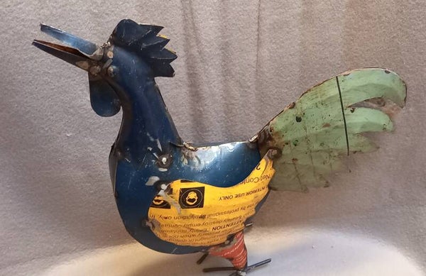 Deze statige haan is gemaakt van hergebruikt metaal.
