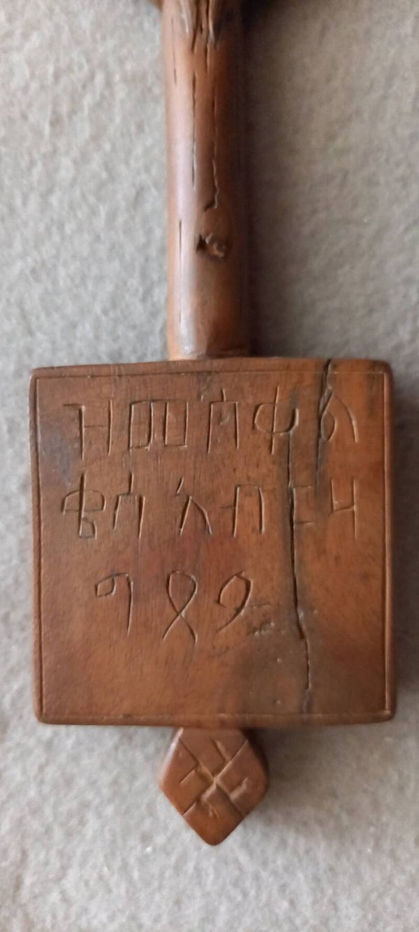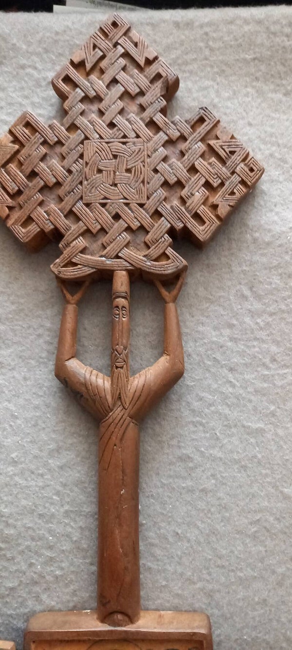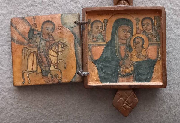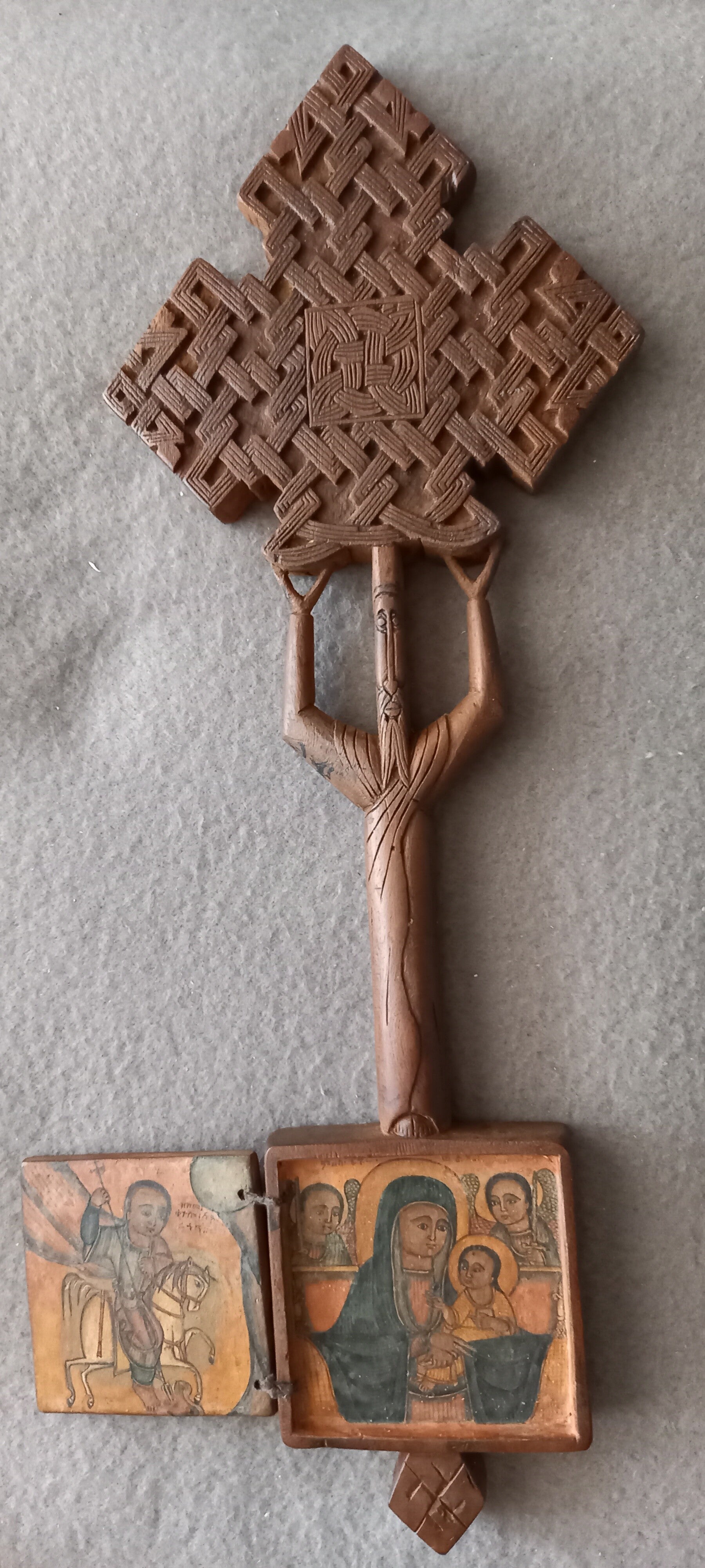Fijn uitgesneden Koptisch handkruis met daarin een 2 geschilderde religieuze voorstellingen