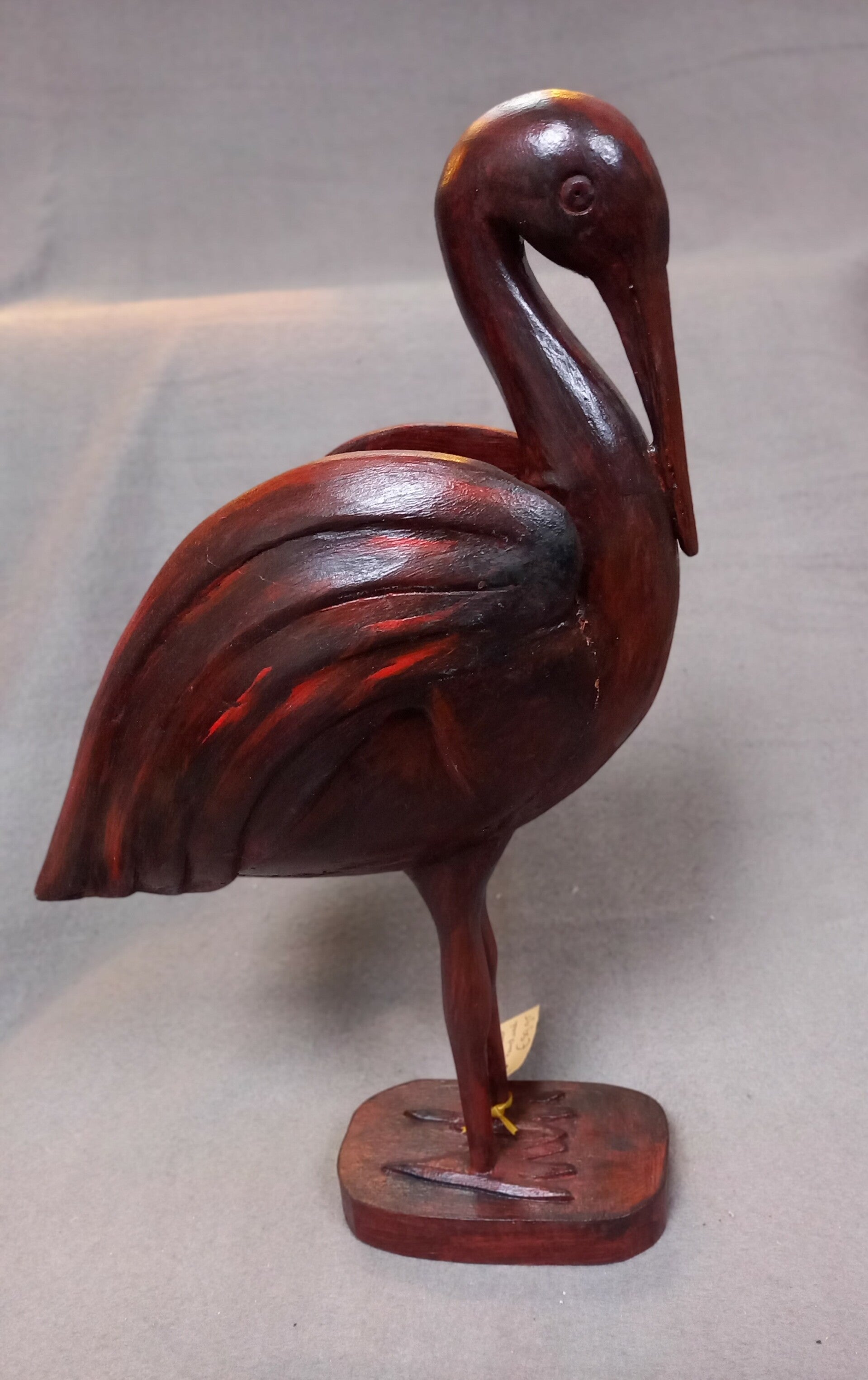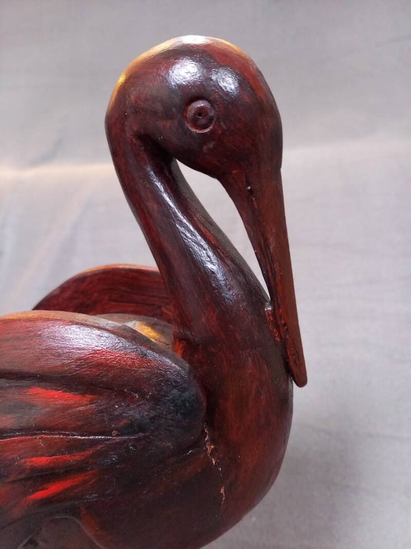 Deze vogel is handgesneden uit hout en handbeschilderd