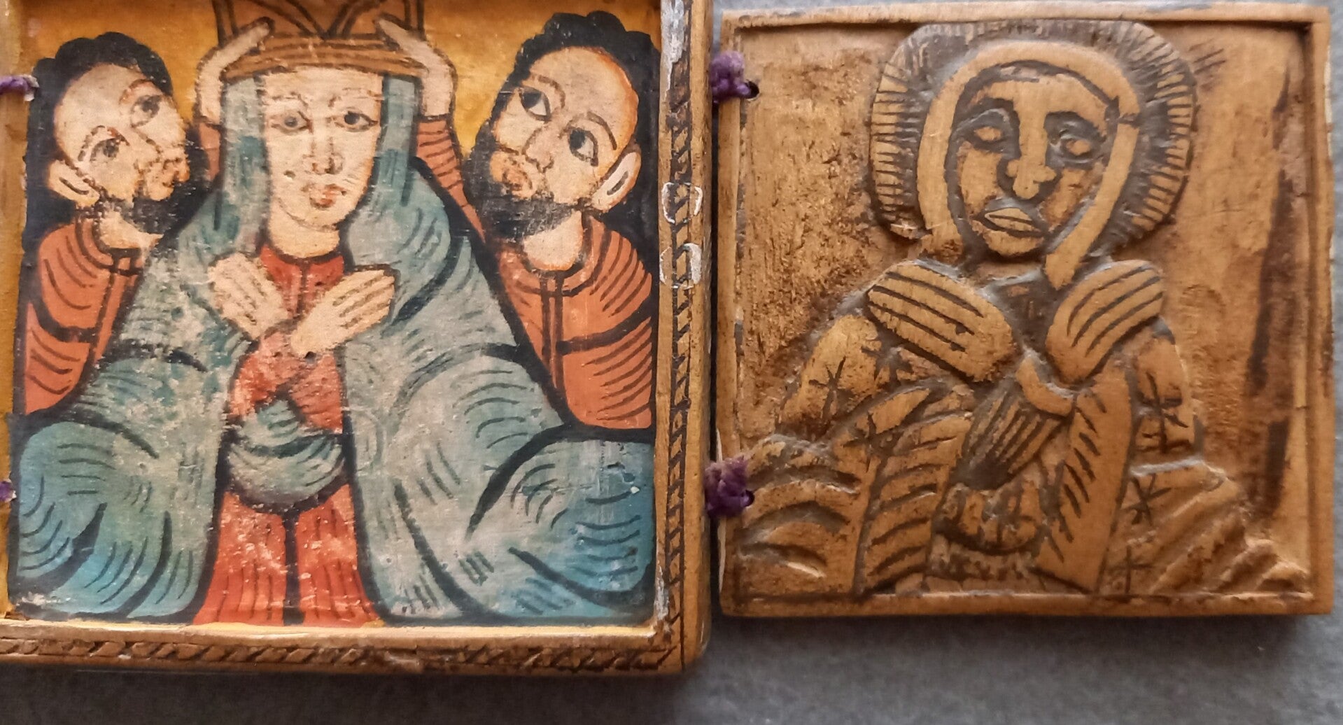 Aan de andere kant Jezus. De schilderingen zijn hier en daar iets beschadigd van ouderdom en gebruik. De deurtjes zijn prachtig uitgesneden. Van 1 deurtje is het touwtje los. Dit soort iconen werden door monniken en gelovigen bij zich gedragen.